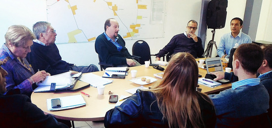 El candidato a intendente de Cambiemos, Sebastián Abella, encabezó una reunión con su equipo de tránsito y transporte, de la que participaron consultores internacionales que están asesorando al equipo local.