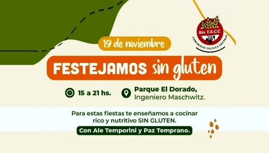 El sábado 19 de noviembre entre las 15 y 21 horas, en el Parque El Dorado de Ingeniero Maschwitz se llevará a cabo una jornada muy importante para personas que padezcan esta enfermedad. Bajo la consigna: "Festejamos sin gluten", la CE.DI.CE (Centro de Difusión de la Celiaquía), llevará adelante una charla sobre Manipulación de Alimentos para celíacos. Y con la presencia de la cocinera Ale Temporini y la licenciada Paz Temprano; mujeres reconocidas y especializadas del país en gluten free, traerán una propuesta súper completa, donde junto a otras profesionales, compartirán experiencias, recetas nuevas y mucha comida.