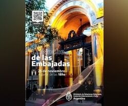 El Director de Organizaciones Intermedias y Diplomacia Pública en el Ministerio de Relaciones Exteriores, Comercio Internacional y Culto, Alejo Sarna, fue el impulsor y el encargado de organizar esta primera edición de un evento tan emblemático como será La Noche de las Embajadas. Con el objetivo de promover el intercambio cultural y el acercamiento de la Argentina con los diferentes países, sus tradiciones, sus raíces y sus orígenes, el Ministerio de Relaciones Exteriores lanza La Noche de las Embajadas. A partir de las 18hs del 25 de noviembre toda la comunidad podrá recorrer las diferentes embajadas, disfrutando de sus propuestas culturales. Las mismas serán diversas, dependiendo de cada embajada e incluyen propuestas artísticas como exposiciones de artes, bailes típicos, exposiciones de libros, entre otras. Además, cada embajada es en sí misma una propuesta artística y arquitectónica que se van a poder disfrutar únicamente en esta noche del año.