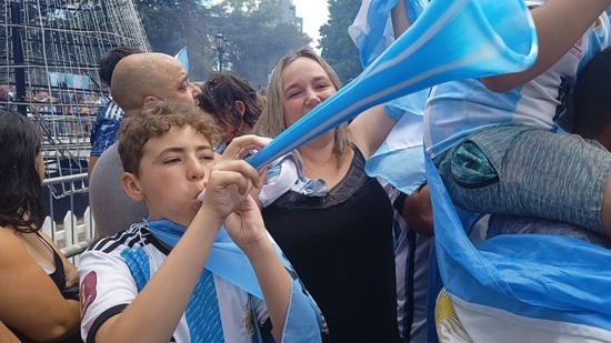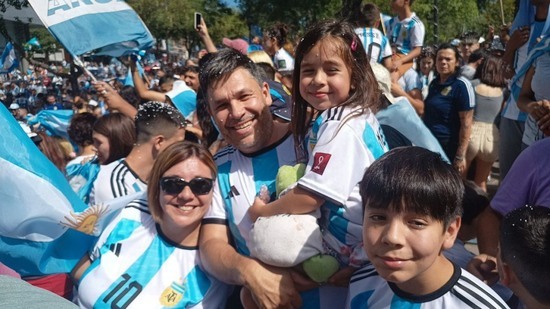 Miles de personas se reunieron en la plaza Eduardo Costa y la avenida Rocca. Como en festejos anteriores -contra México y Polonia por fase de grupos, y versus Australia, Países Bajos y Croacia en los choques de eliminación directa- las calles se tiñeron de celeste y blanco y también del violeta de la casaca alternativa. Además de remeras, hubo banderas, pancartas y figuras troqueladas de los jugadores -después de Messi destacaba Di María-, maquillajes y replicas de la Copa del Mundo alzadas bien alto en el aire.