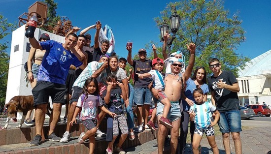 Personas en silla de rueda o con movilidad reducida, adultos mayores, padres, hijos, nietos: se complica imaginar quién en la ciudad no haya querido arrimarse al centro para compartir la alegría en comunidad, tomando también cerveza, fernet o lo que el vaso o improvisado envase que llegaba a la mano ofreciese. Hasta aparecieron vecinos con mascotas maquillas con celeste y blanco para reforzar el pintoresquismo de la memorable jornada.